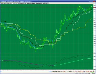 Vyskúšať takmer všetky indikátory je úplne prirodzené a priam súčasťou každého (vrátane mňa) kto príde do styku s burzovým trhom. Rozhodujúca je len pevná vôľa samotného tradera a chuť pokračovať i keď sa leje do topánok... Preto som sa rozhodol venovať všetko úsilie tomu, čo reálne na Forexe funguje a čoho dôkazom sú výsledky ludí na čele so Sidom, reč je o Sidových "udelátkach" :-) Priložený obrázok opisuje môj súčasný systém (základom sú na prvý pohľad známe indikátormi) ktorý sledujem a ladím. V záujme pokroku si rád vymením odpozorované skúsenosti tu na webe alebo na ICQ čísle 107576169.