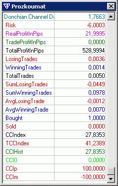 Marku a ostatní, ještě jsem doplnil Markův Profit Display o další věci, co mi v klasickém PD vždy chyběly. Když už máme počet ztrátových a ziskových obchodů, proč nemít ještě součet všech ziskových a součet ztrátových obchodů a pak průměr na jeden obchod. Je potřeba všechny proměnné, které chcete zobrazit dát na výstup AOS (záložka se jmenuje vstup) do stejného okna a označit nějakou tenkou barvou. Viditelné položky budou jen Celkový profit - TotalProfitInPips, okamžitý profit z jednoho obchodu - RealProfitInPips a celkový profit z jednoho obchodu -TradeProfitInPips. Ostatní položky jsem podělil 10000, tedy počtem desetinných míst, které ukazuje VT. Nejsou tedy viditelné, ale přes inspection window zjistíte hodnotu. Neberete v úvahu, že jsou za desetinnou čárkou, ale berete číslo jako celé (nebo si to vynásobte 10000). Např. 0,0070 znamená 70. Milan
