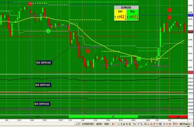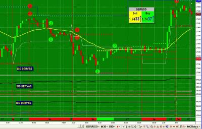 Protože se blíží Vánoce a je čas dárků, dávám k dobru jeden svůj AOS z "tajného" arzenálu.. :). Systém je založen na neprávem opomíjeném indikátoru Dervas box, který je k mání i v základu VT. Dervas box myslím dost dobře "simuluje" hranice S/R a možná částečně i Fibonacciho linie. Systém obsahuje 2x Dervas box v nastavení 5 a 10 a jen jeden ! EMA v periodě 34 (žlutě). Pro doplnění, jen pro vizuální kontrolu, je přidán Delta price v Optimu. Systém obsahuje dva vstupy/výstupy pod čísly 1 a 2 a reaguje na protnutí Dervas box linie. Výhodou je vzájemná kombinace a zachycení double vstupem/výstupem v daném trendu. Dervas box se dá využít i jinak (např. ve spojení s Delta Price nebo s jinými druhy MA) nebo se dají nasimulovat i tři, čtyři Dervas boxy, ale o tom až za týden.. :). Přikládám dnešní 30 min. grafy euro a cable, včetně PD a popsaný AOS. Nastavení Dervas boxů musí být vždy adekvátní minutáži grafu !! SID