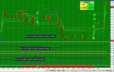 Když už jsem dnes v tom rozdávání "dárků" :), přidám ještě jeden AOS. Tento AOS je obsažen i v základní nabídce VT pod názvem VT-Level Stop-Reverse System. Celý AOS je založen na využití funkce Delta Stop a Trailing Stop Level (TSL) hranice s ATR, ve vztahu k ceně. Používá buď mód optimum nebo manuál v nejčastějším nastavení 0,002-0,004. TSL považuji za jeden z nejspolehlivějších ukazatelů směru trendu vůbec, ale jeho využití jako AOS, vhledem k prodlevám ve vztahu k volatilitě trhu, za trochu problematické. Vše závisí na minutáži grafu, druhu módu, který člověk zvolí, ale i na dílčím měnovém páru. V klasickém VT Level Stopu to funguje vždy zajímavě. ale je to poplatné jen tomu jednomu módu. Proto jsem zvolil cestu více TSL v jednom AOS, které reagují nezávisle na sobě. Ve směru trendu reaguje TSL vždy dobře a změny směru vyrovnávají právě dílčí TSL navzájem. Opět je důležité nastavení pro každý min. graf (a mnohdy i pár) jinak. Příklad je na 30 min. graf, kdy jsem zvolil 1. v módu optimum a pak už manuál hodnotách, jak jsou na obrázku. Rentabilita je tam zajímavá, jak u euro tak u cable a TSL doporučuji spíše pro delší min. grafy. Při kratších min. grafech se musí manuál módy snížit na hodnoty tak 0,001-0,002. AOS tedy obsahuje 4 buy/sell vstupya v AOS jsem rovněž změnil možnost volby ceny (standardní vychází jen z Close), takže člověk si může např. vyzkoušet jak reaguje haClose, Open atd. AOS dokáže "nadělit" celkem slušně a dílčí ztráty překryjí většinou zisky z jiných pozic nebo současné vícenásobné vstupy při trendu..A protože je to dárek, doporučuji vyzkoušet a neházet do koše.. :) SID
