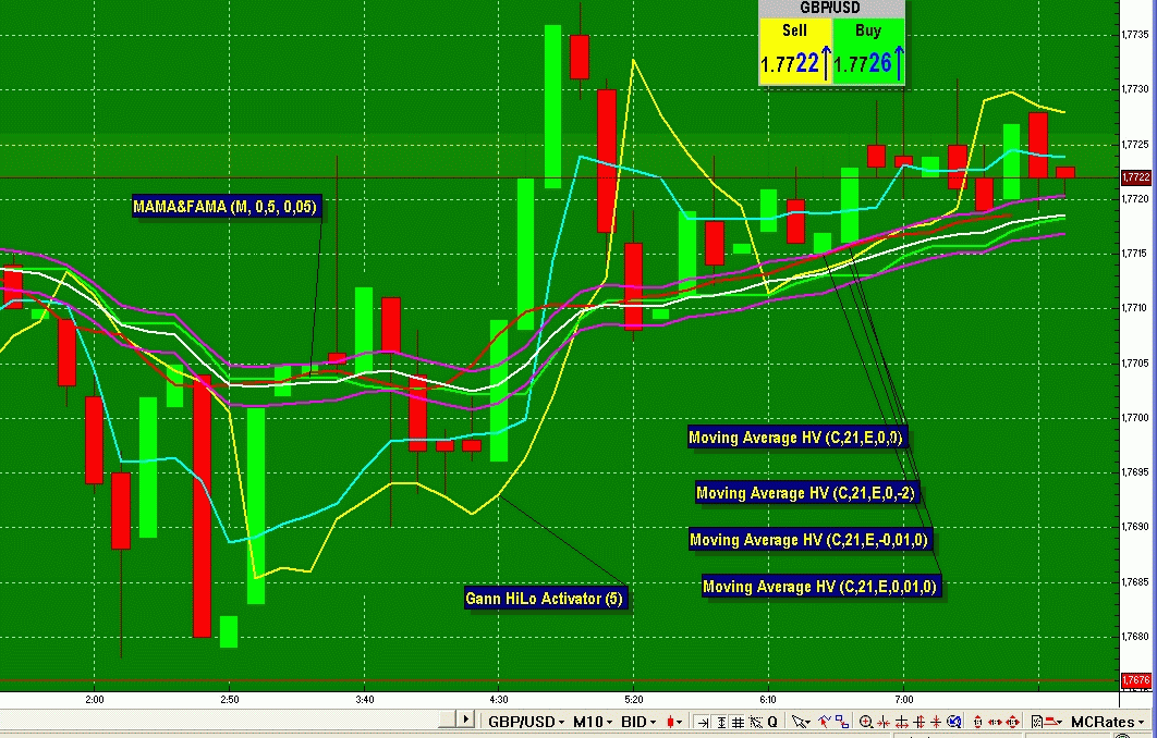 To Namodro Tak to jsem opravdu rád, že nejsem šarlatán.. :) Za to tvoje "děkuji" i já děkuji, protože to člověka potěší, když cítí nějakou kladnou odezvu.. :) Ale vrátím se k tomu systému (pro ty co to ještě úplně nepochopili). Použití horizontál a vertikál hodnot má za účel sledovat stav trhu a přidáním dalších indikací (na "rozpitvaném" obrázku jen MAFA a GHILO) potvrdit předpoklad. Použit byl EMA 21 (oko bere..) a tři totožné EMA s HShiftem -2 a dvěma vertikálami 0,01 a -0,01. Ty vytvoří jakýsi rukáv či tunel a v podmínkách algoritmu je stanoveno, především vztah aktuální ceny k indikátorům (nad/pod), k rukávu, k jednotlivým crossům (vzájemné crossy) a pip filter (přiblížení Mama a Fama). Pak si k tomu ještě přimysli BB a Kamu a dostaneš celkem ucelený obrázek o systému.. Příklad je z dnešního cable (cca od 10,00 hod. s předpokladem růstu). SID