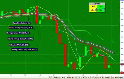 To Obsevator Většinou v reálu obchoduji na 10-15 min. grafech, ale podle situace někdy i na 5 min., to když vidím zřetelný trend a proč se okrádat na 15, když lze stejně využít i 5 a 10 a kumulovat tak pipsy... :) To co dal tady namodro je fikce, která trochu to, co používám, zprofanovala, pokusil jsem se to vše vysvětlit výše. Znovu tady dávám totožný graf (cable 10 min.) o něco později. Zhruba kolem 15,40 (cca hodinu po zprávách) se vychýlila mimo "tunel" EMA 21 s HShiftem -2 ( a zůstává mimo i nadále), a podobně reagoval i GHiLo (svíčky šly pod křivku), stejně jako "tunel" EMA21, který šel nad graf. Podobně reagoval i Mafa (cross) a v algoritmu totožně i BB a Kama. (porovnej s předchozím grafem, kdy se HShift -2 vesele "vezl" v tunelu). To byl pro signál pro můj vstup Sell na cable, který jsem zavřel cca kolem 17,00 hod. se ziskem cca 80 pips, když šly svíčky nad GHilo. Toť vše, žádný zázrak, ale funguje mi to... SID
