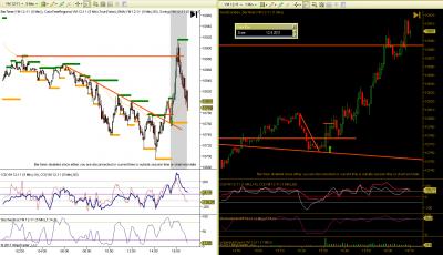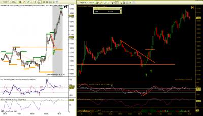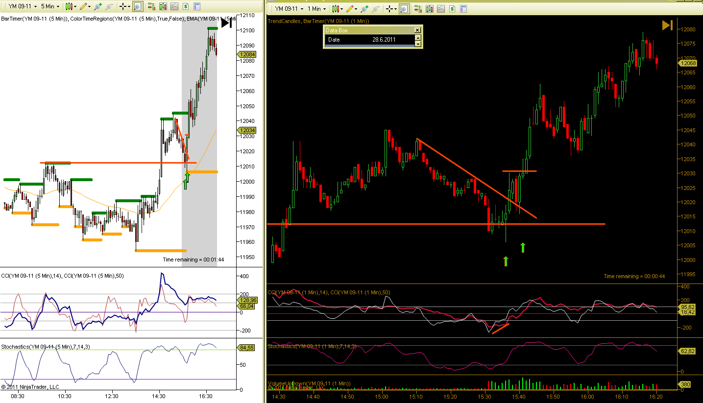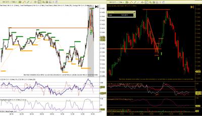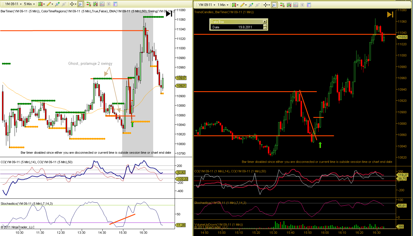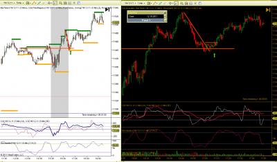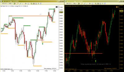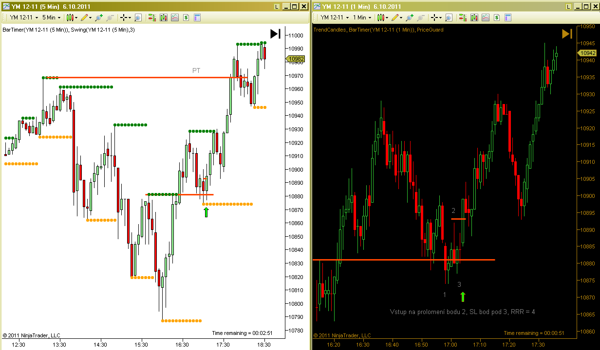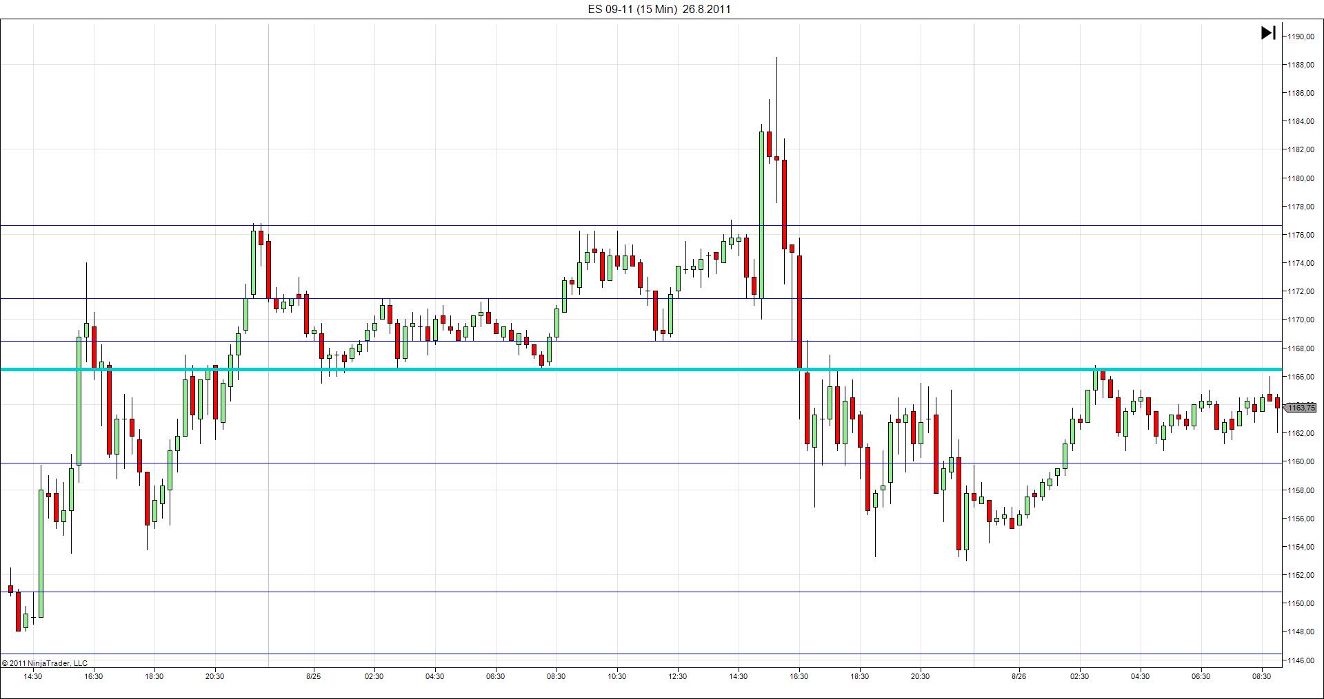Dobrý den, učím se, jsem ve fázi BT a PT. Snažím se postupovat podoběn jako Petr. Přikládám ukázku ze dne 28.8.2011. Na ES 15min hledám silné S/R a pak na Range4 obchoduji. Na grafu je nazančeno 5 možných vstupů. Prosím o rekaci Petra nebo jiných zkušených traderů, který vstup byste považovali za vhodný a proč. Díky.