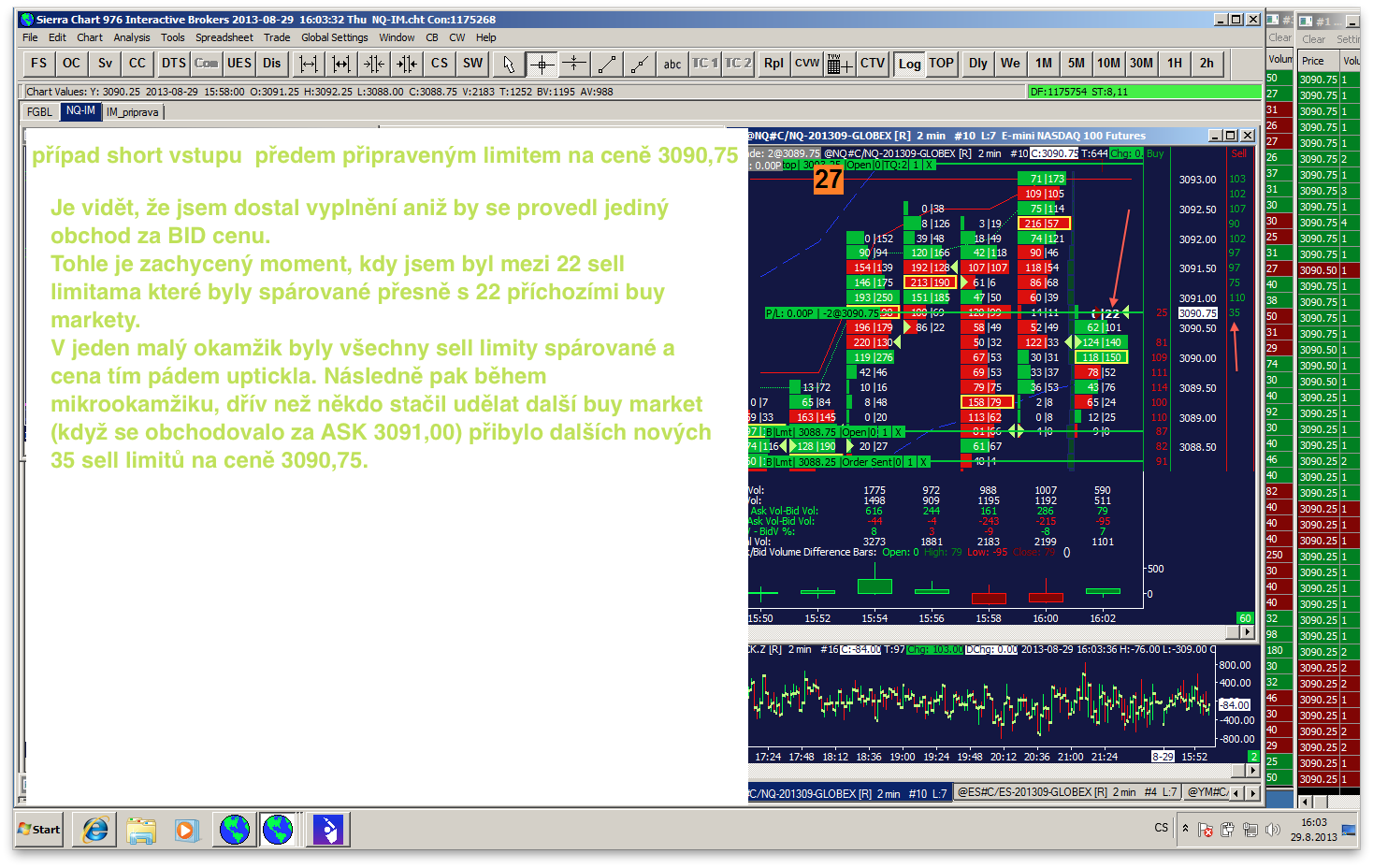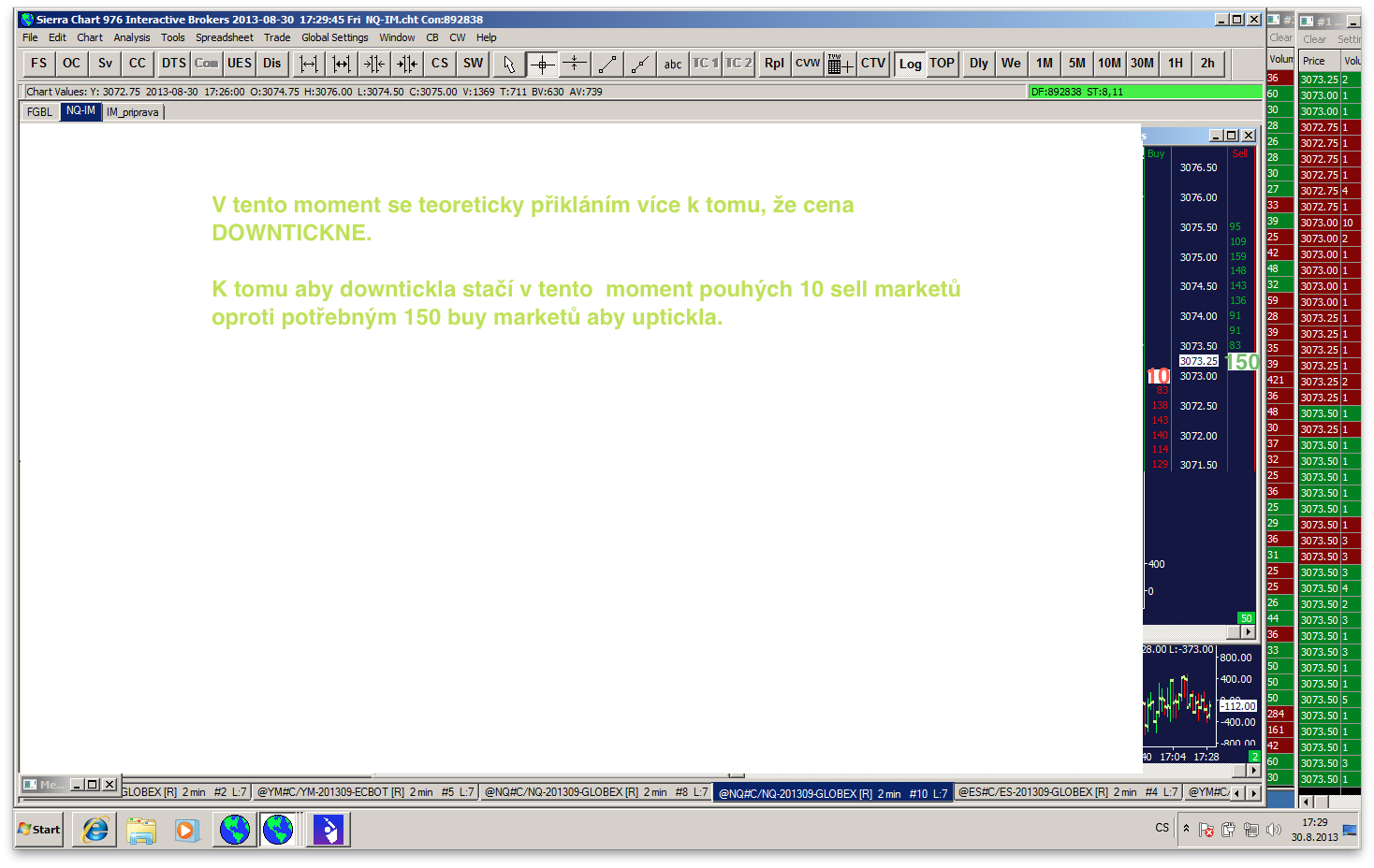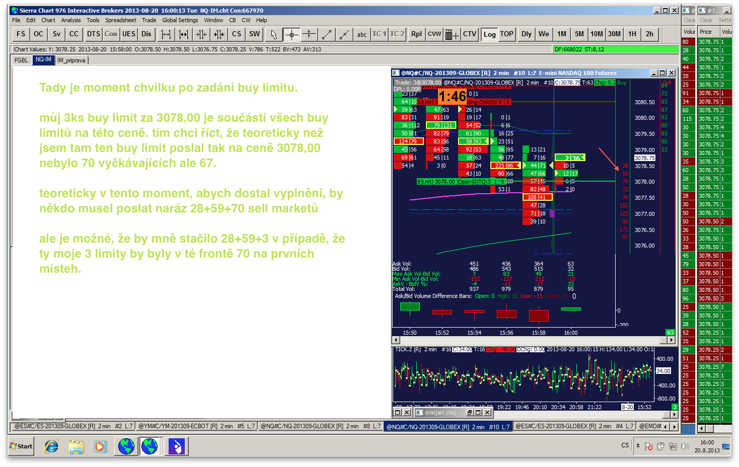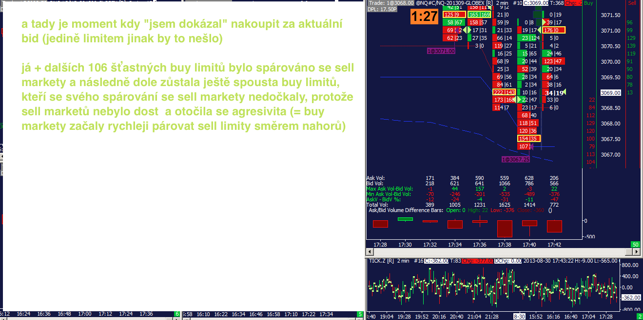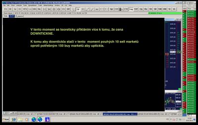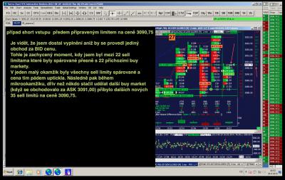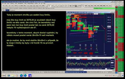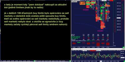 představte si situaci, že chci prodat za každou cenu. takže zvolím sell market. (vycházím s priceladderu na obrázku výše) protože jsme celkem daleko od burzy a máme nějakou rychlost připojení, tak dochází k nějaké prodlevě. Když bych v tento moment klikl sell market, tak je možné, že někdo zlomky vteřiny klikl taky sell market s větším objemem těsně předemnou. pokud by ten kdo klikl předemnou (nebo jich mohlo být víc) prodal sell marketem počet kontraktu 10+83+138+143 tak můj sell market dostane spárování s buy limitama až na ceně 3072.