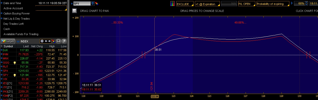 ja to vidim nasledovne: klicove jsou vypsane opce a ke vzdalenosti od aktualni ceny SPY se da pristoupit bud fixne (napr. 2 nebo 3 striky nebo variabilne dle delty (dle aktualni situace na trhu pri zachovani priblizne stejne pravdepodobnosti - ono v ramci tydne moc na vyber stejne neni), ochranne opce mohou zafungovat pro nekolik vypisu weeklys opci - pokud trh bude spolupracovat - a tak se usetri komise (jinak strategie se samozrejme muze po tydnu zavrit a otevrit komplet novy DD). Zajima me napadena vypsana opce respektive pokud volim rizeni DD, tak pri priblizeni k B/E bodu (je kousek za vypsanou opci) na te ci one strane roluju vypsanou opci na nizsi strike (put) nebo vyssi strike (call) a tim si posunuji B/E bod strategie. Pokud je treba rolovat do stredy, tak na te same weeklys opci, od ctvrtka jiz na dalsi weeklys. Cena nakoupenych ochrannych opci presahuje cenu vypsanych,proto je to debetni strategie, to nesouvisi se ziskem/ztratou. Edge je ve "spaleni" vypsanych opci pri idelane udrzeni se trhu blizko jedne z vypsanych opci, kde je max. profit. Jinak DD strategie je VEGA pozitivni a tudiz nam pomaha rust volatility a trpi pri poklesu volatility.