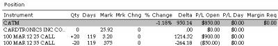 Kombinovaná směrová strategie. Abychom co nejvíce podpořili svoje profity na burze pochopitelně kombinujeme vzájemně jednotlivé strategie. Pojďme ke konkrétnímu obchodu. Není nad praktickou ukázku. Nejdříve fundament. V hledáčku našich obchodních příležitostí uvízla 5.11.2011 společnost Cardtronics, Inc. (Nasdaq: CATM ) To je velký provozovatel bankomatů v USA a nejenom tam. Řadou fúzí v minulých letech pozvolna začala ovládat podstatnou část tohoto lukrativního trhu a mezi její zákazníky patří i mnohé velké banky v USA. Zejména pak Citigroup, JPMorgan Chase, Scotiabank a Sovereign Bank. Celkové příjmy ve druhém čtvrtletí vzrostl o 11% oproti předchozímu roku na 147,3 milionů dolarů. Na akcii zisk vyskočil o 31% na 34 centů na akcii. Analytici očekávají za třetí čtvrtletí zisk o 37 centů na akcii, o 32% než před rokem. Vidí růst zisku o 31% za celý rok, na 1,31 dolarů na akcii, a dalších 18% nárůst v roce 2012. Společnost v pondělí 7.11.2011 po uzavření burzy ohlašuje hospodářské výsledky. Jsme přesvědčeni, že krátkodobě, ale i z dlouhodobějšího hlediska by měla mít vzestupnou tendenci. Otevíráme následující obchod: Na strike 25 s exspirací MAR 2012 nakupujeme příkazem MARKET 20 CALL opcí společnosti CATM a na strike 35 se stejnou exspirací a počtem . Příkaz vypadá následovně : BUY +20 VERTICAL CATM MAR 12 25/35 CALL MKT Poměr P/L je 14.900,-/5.169,95 USD tedy cca 3/1. Současně bez ohledu na přesvědčení svoje a analytiků se ale raději krátkodobě zajistíme. Nakoupíme 20 PUT opci na strike 22.50 s exspirací NOV11. Příkaz vypadá následovně : BUY +20 CATM NOV 11 22.50 PUT MKT Pojistka stojí jen 73,95 USD a pokud cena poroste tak jak očekáváme tak 8.11.2011 ochranné opce s menší ztrátou prodáme. Obchod ukončíme: Jakmile dosáhne 30% ztráty. Pokud dosáhneme profitu nad 100 % zavíráme polovinu kontraktů s profitem a zbytek necháme v trhu. Končíme obchod, pokud je vypsaná opce mírně v penězích , nebo očekáváme fundament proti naší pozici. 18.11.2011 Před otevření burzy Obchod běží zatím docela zdárně je na něm něco přes 800 USD plovoucího profitu tedy okolo 16% za necelé dva týdny. Obchod kombinuje slušný poměr cena/výkon se současno rozumnou mírou rizika.