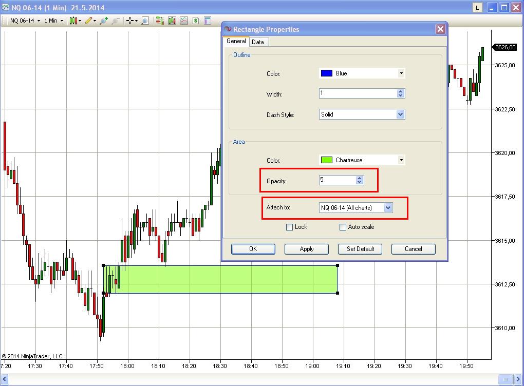 Tom8: Nevím jestli ti to pomůže, ale pokud chceš nastavit opacitu kresleného obdélníku, tak si dej double click levým tlačítkem myši na nakreslený obdélník a nastav si hodnotu Opacity jak potřebuješ. Pokud chceš, aby se ti obdélník vykreslil i na ostatních otevřených grafech (např. s jinými time frame), tak si nastav Attach to na All charts. Pokud chceš aby se kreslený objekt (nebo třeba indikátor) vykresloval v hlubší nebo naopak vyšší vrstvě (a nepřekrýval/překrýval cenu nebo cokoliv kresleného), tak na něj dej double click, podrž Shift na klávesnici a prostředním kolečkem na myši si nastav vrstvu jak potřebuješ.