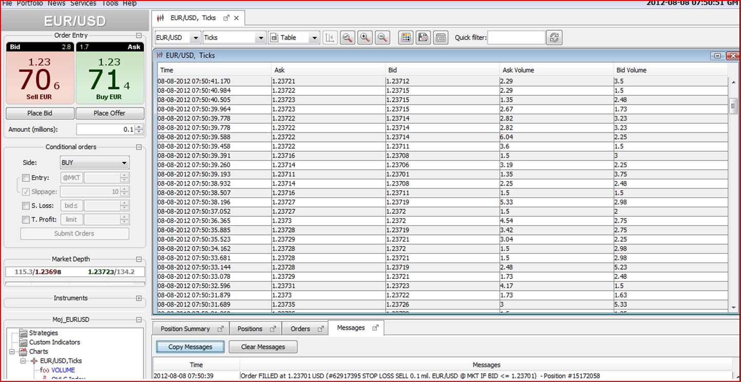 Ahojte, chcem sa podelit o moje posledne skusenosti s Dukascopy (live account) a spytat sa na Vase skusenosti ohladne spolahlivosti tohto fx brokera. Poslednych par dni sa mi stava, ze mam STP zasiahnuty presne na tick a je jedno, ci je kusok pod extremom alebo na nom (vsetky 3 obchody su do longu, takze sa jedna o bid cenu pri STP) Prikladam print-screene spolu s tabulkou tickovych dat v tom case. Vsimnite si nahly pokles bid ceny (respektive fluktuaciu v ramci 3 po sebe iducich quotacii) presne na hodnotu mojho STP a zaroven rozsirenie spreadu medzi bid-ask.