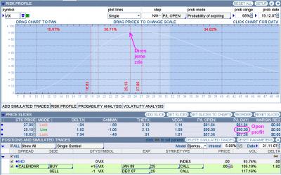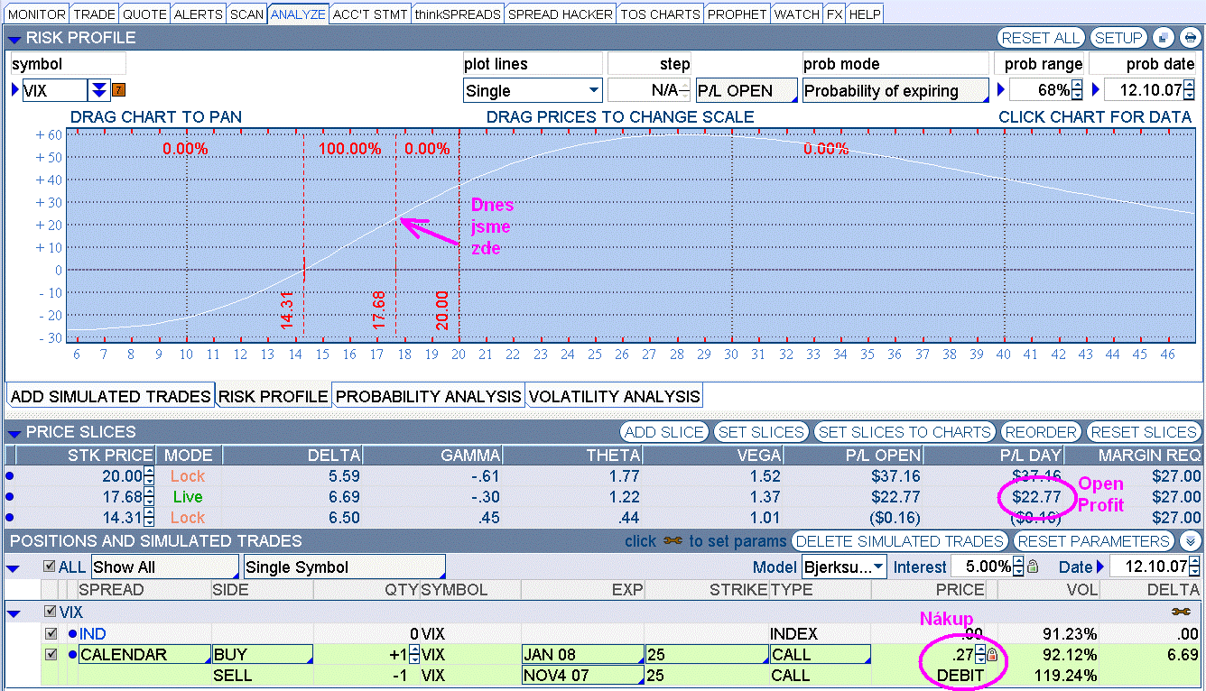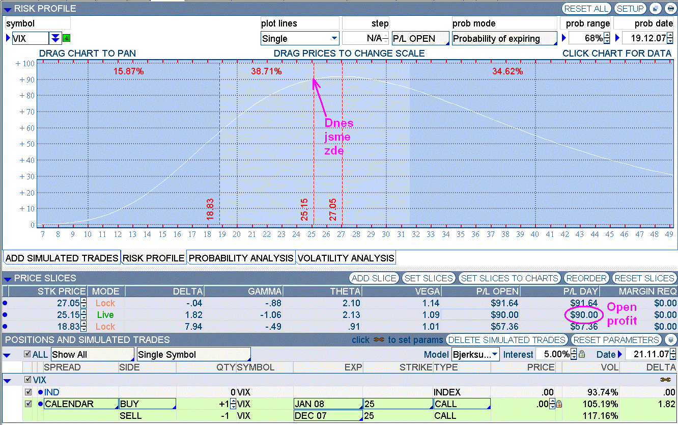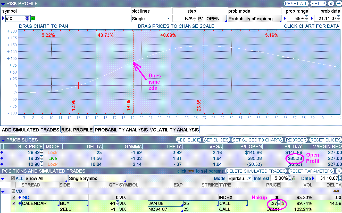 Pojďme se podívat, jak se chová pozice výše uvedená pozice [bold]VIX 25c -NOV07/+JAN08[/bold], která mohla být otevřena před 4 dny : Pořizovací cena : [bold]-0,27 / k [/bold] Otevření profit (aktuální) : [bold]+0,2277 / k [/bold] Pokud bychom dnes uzavírali, dosahujeme zhodnocení téměř 85% za 4 dny (pokud nebudeme počítat margin). Z grafu je však patrno, že pozice má pořád růstový potenciál. (tu)