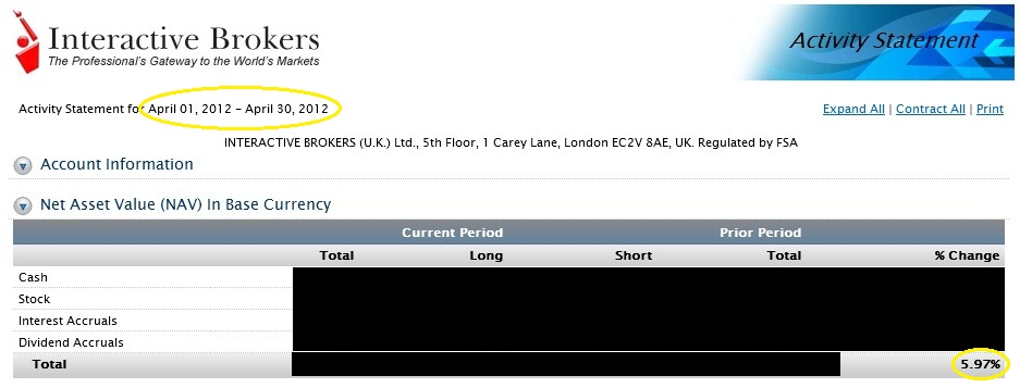 Přeji krásný první máj :) Jak jsem slíbil, dávám sem svůj procentuální P/L za poslední měsíc, tj. duben 2012: 5,97% (viz screen). Pro srovnání: index S&P 500 ($SPX) za totéž období: -0,75%. V dubnu jsem uzavřel 15 obchodů, z toho 53,33% skončilo v zisku (v alespoň nějakém zisku, ne nutně na PT; nejvíce potěšily GCA a AUQ). Risk na obchod max. zhruba 1,5% účtu. Žádné mimořádné události (typu velké gapy) mě nepotkaly. S tímto výsledkem jsem velmi spokojen a ani neočekávám, že by se mi takhle dobře dařilo neustále (znamenalo by to přes 70% p.a. a tak vysoko ani necílím). Možná bylo klíčem k úspěchu to, že v situaci, kdy hlavní indexy složené z velkých firem v dubnu předvedly jistou korekci (případně zahájily pokles, až budoucnost ukáže, jaký scénář se vyplní), jsem se zaměřil spíše na menší firmy s vlastním specifickým "příběhem".