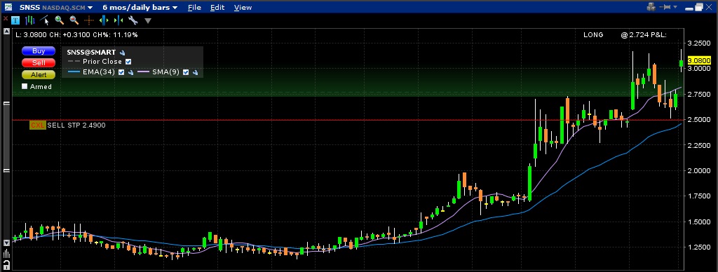 No jo, teď na to taky koukám, to jsou věci... Prostě ty dobré výsledky již byly započítány v ceně ještě před jejich zveřejněním, to se taky stává... Já teď vystupuju ze SNSS, což jsem koupil (10.4.) za 2,72 (viz obrázek), a to nikoli proto, že hezky poskočil (zhruba o 12 procent vzhledem k mé nákupní ceně, nicméně pořád je to pod mým PT), ale hlavně proto, že po zavření trhů bude mít report, a já mám pevnou zásadu, že když je report, jsem mimo trh. Jistě, mohl bych spekulovat, že tenhle skok je dílem insiderů a že to pak po víkendu poroste dál, ale spekulace tohoto typu mám přísně zakázané :) Mimochodem, pro dnešek mám spoustu "short ideas": GLD, USO, EWZ, AUQ, LVLT, BHP, CAT, SVM, VZ, TC. Něco z toho vezmu, mám přece jen ještě dva otevřené longy (GCA a XIN), které budu s největší pravděpodobností držet přes víkend, takže hedging se šikne.