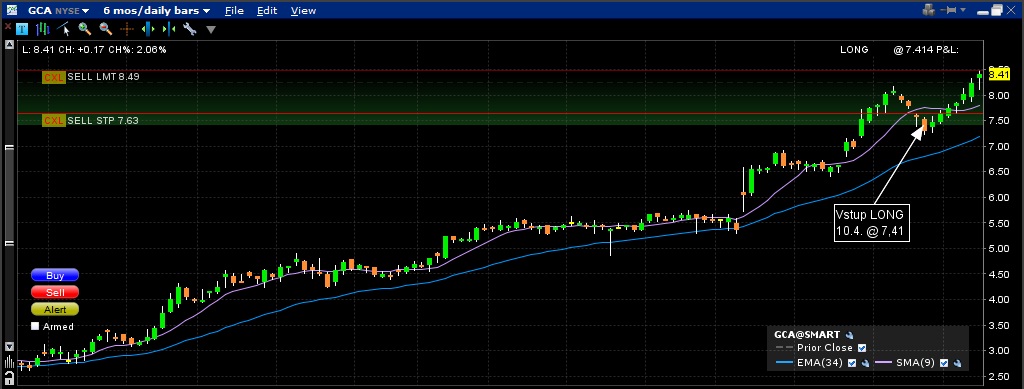 Tak koukám, že nakonec byl dnes i jeden PT. Jde o GCA, viz obrázek. Screen jsem si udělal na začátku seance, PT (8,49) byl dosažen později (jak vidno, SL už byl dnes přitažený do zisku). Zisk 14,57%. Ten PT jsem tam měl fixně od vstupu do obchodu. Byl to takový můj typický obchod, který dobře ilustruje moji strategii. Trh se rozjel do trendu a udělal korekci, na níž jsem naskočil. Prostě klasika :)