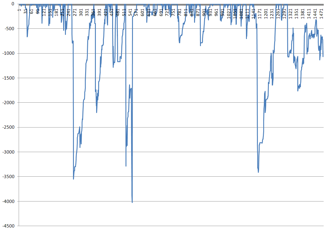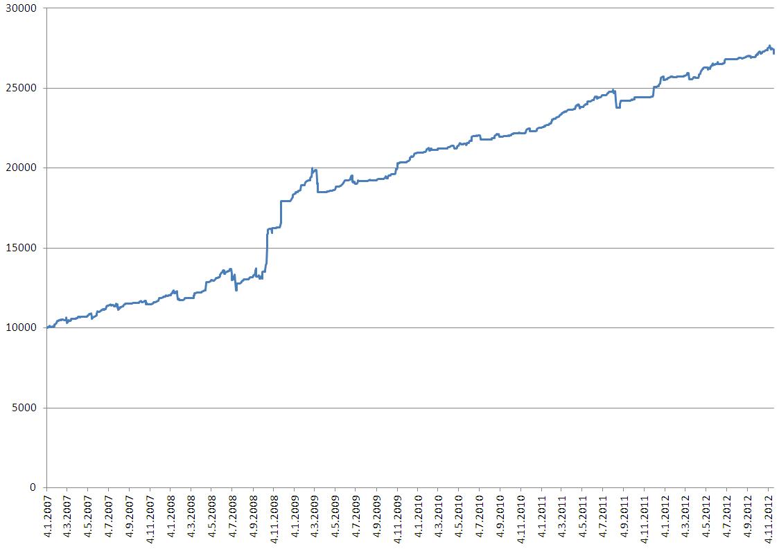 kocosh: Dle mého backtestu to za 6 let při kapitálu 10tis. USD dá bez position-sizingu cca. 180 % při 1750 obchodech. Tzn., že si svůj kapitál vynásob ziskem a odečti od něj 3500 USD za komise.