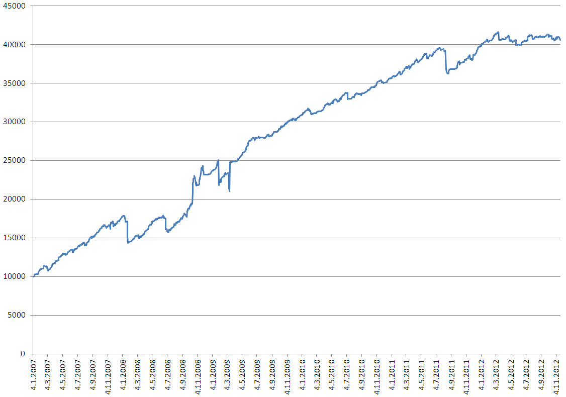 Pokud by to někoho zajímalo, tak jsem udělal backtest na S&P 500. Dělal jsem ho kvůli tomu, že jsem chtěl vidět, jak se změní využití kapitálu s více akciemi. Testované období 2007 - 2012. Vynecháno pár titulů s nízkým volume. Výsledky: Zisk (bez position-sizingu) se cca. zdvojnásobil. Úspěšnost zůstala na 81%. Využití kapitálu stouplo z 25% na 58% Počet obchodů: 1750 -> 4000 Co se pro mě zásadně změnilo, tak to je DD, který stoupl z cca. 15% na 40%. Velkých hodnot dosáhl několikrát a to skokově. Holt akciím z S&P 500 se asi nedá tolik věřit, hlavně v případě obchodování bez SL.