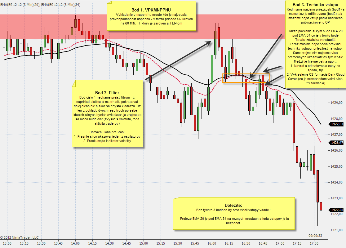 Keď pôjdem podľa bodov, ktoré uviedol stranger, tak bod 1 je nájsť si oblasť vstupu (súhlas) napr. S/R, trend line,ktoré nám práve zobrazujú zaujímavé miesta z minulosti. Bod 2 vstupný patern (súhlas), osobne používam PA paterny. Bod 3 filter, mne ako filter postačujú dve EMA. Otázkou je aké EMA použiť, moje obchody sú na denných grafoch a rýchle EMA mám s periódou 8dní, čo je priemer zhruba jeden a pol týždňa a druhé s periódou 21 dní, čo je priemer posledného prac. mesiaca. Ak chcete obchodovať na minútových TF, tak mi príde vami zvolená kombinácia EMA 20 a 34 trochu nejasná a skôr by som volil u pomalšej väčšiu periódu. Ide o to, že EMA vám budú znázorňovať trend prípadne zmenu trendu, ak dáte nízku periódu na nízkom TF, tak bude problém či ide o zmenu trendu alebo korekciu. Ale možno máte vami zvolenú kombináciu overenú.