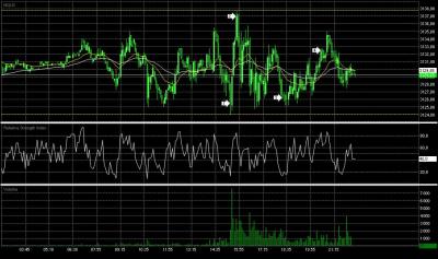Zdravím, kdybych dnes postupoval podle dnešního článku, tak bych zřejmě neutržil ztrátu, ale samé zisky:-) při dělání obrázků z grafu jsem si všiml na 5 minutovém grafu, že všechny vrcholy a dna, na kterých se dnes e-mini Nasdaq odrazil do opačného směru byly na RSI výrazně překoupené, tj. oblasti nad 80 a pod 20, vrcholy a dna na RSI odpovídají šipkám ve stejném čase, nejde vkládat šipky do indikátorů, ale jsou viditelné, dejte si tam třeba list papíru, šipkami jsem označil vstup limitem na close úseček, kde se mělo vstupovat, trh nabízel pěkné pohyby 8-12 bodů, chci se zeptat, zda si někdo nekomplikuje situaci a vstupuje takto na přeprodaných a překoupených úrovních oscilátoru, když trh vytváří tato krátkodobá momenta jako dnes určitě tuto metodu při této situaci v trhu vyzkouším, jen snížím PT kdybych se více učil z nekonečné studnice znalostí Petra a Tomáše, mohl bych být už o něco dále...:-)