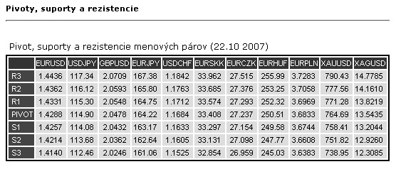 Za každých podmienok je údajne spoľah na pivot, suporty a rezistencie. Lenže neviem ako ich získať. Niekto píše len "okukať" z grafov a zakresliť, iný počítať pivot podľa prdošlého dňa a SR podľa Fibronaci (cik to uverejňujú). Skúšam VTtrader, kde sa mi podarilo dostať na graf akési SR z TA pomôcok, ale neviem čo sú zač. Čo sa tam mení zmenou nastavenia a ako to vypočíta úrovne. Pivot sa mi vo VTtraderi nepodarilo dostať na graf vôbec (aj spolu s Fibronaci), len sa objavil biely obdĺžniček, že pivot je k 17:00 hodine (NY) a nič viac, žiadna čiara. Nesťažujem si, učím sa a rád privítam dobré rady.