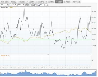 Volatilita, DAX a VDAX-NEW (pozor, existuje i VDAX "bez NEW") U indexu DAX se dá volatilita odečítat z indexu VDAX. VDAX se udává v % (bodech) a indikuje očekávanou volatilitu na příštích 30 dní. V němčině se mu říká také "Angstbaromert", nebo-li měřič strachu u apetitu na riziko u investorů, v angličtině je znám jako "fear gauge". Jeho hodnota se aktuálně pohybuje někde mezi 15 a 20, pro srovnání, v době vrcholu krize v 10/ 2008 dosáhla hodnota více než 80 bodů. platí tyto zásady: - klesá VDAX, potom DAX roste - roste VDAX, potom DAX klesá - roste VDAX i DAX, potom je zde medvědí varování pro DAX - klesá VDAX i DAX, potom je zde býčí varování pro DAX graf + hodnoty performance / volatility: http://www.dax-indices.com/EN/index.aspx?pageID=25&ISIN=DE0008467408 grafy, kde lze oba indexy porovnat: http://www.boerse-frankfurt.de/en/equities/indices/vdax+new+DE000A0DMX99/chart http://www.comdirect.de/inf/indizes/detail/chart.html?ID_NOTATION=12105789#benchmarkNotations=20735&benchmarkColors=3366cc&selectedBenchmarks=true&e& pro ty, kteří chtějí počítat "index fluctuations (range): http://daytrading.about.com/od/indicators/a/VDAXDailyRange.htm 4 000 DAX 20% účastníků trhu, kteří očekávají rozsah 800 DAX x účastníků trhu 30 dní 365 rok 0,287 odmocnina z 30/365 229 DAX x účastníků trhu x odmocnina 3 771 low 4 229 high hodnoty lze získat zde: https://www.cortalconsors.de/Wertpapierhandel/Aktien/Index-Snapshot/Kurse/Historische-Kurse/DE000A0DMX99-VDAX-NEW-VOLATILITAETSINDEX;jsessionid=3AD4EF44CCECC2B77DE6287282638B20.app221