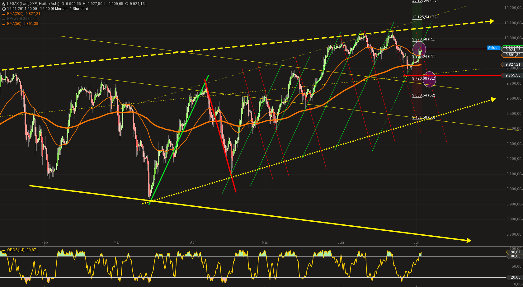 nedá mě to, ale musím napsat pár řádek k této větě v článku: _______ Samotná myšlenka EMA34 + EMA204 a TNG je v podstatě důležitější a silnější než CCI a nesmysly jako "úhly" a "přesný počet milimetrů", protože obě EMA a TNG jsou v podstatě osvědčeným konceptem síly trendu a nákupu/prodeje na korekcích do něj. ________ Týká se to problematiky měření úhlů. V příloze je graf s těmito parametry: trh index DAX / 4 hodiny / Heikin - Ashi svíčky. Dle mého názoru problematika měření úhlů při sestavování koncepcí obchodování v trendu není nesmyslná. Pokud je doplněna vhodnými indikátory technické analýzy, zde stručně EMA 200 / EMA 50 / OBOS, má měření úhlů naopak velký význam. Existují obecně dva koncepční přístupy: 1/ viz. příloha, sklon úhlu si vezmeme z "přiměřeně" vhodného vzorku, zde tlustá červená a zelená plná čára. Někdo by mohl namítnout co že je to "přiměřeně", to je ale obecně problematika mimo rámec této diskuse. Obecně se dá říct, že je úhel dvou hlavních trendů jdoucích po sobě ve vzdálenosti týdnů až měsíců od aktuálního stavu v případě střednědobého obchodování. 2/ Existuje i model výpočtu, kdy se software nastaví do určitého rozlišení a následně se počítají úhly a vzdálenosti. Úhel je obecně 45 st. (nemusí být) a vzdálenosti jsou dány kalkulovaným koeficientem pro konkrétní trh (např. EUR/USD, DAX, S&P500 aj.) a časový rámec kterým jsou násobeny aplikované hodnoty OHLC, popř. Heikin - Ashi OHLC. Má s tím někdo podobné zkušenosti?