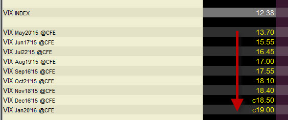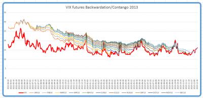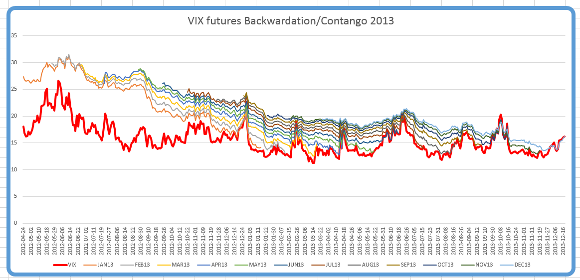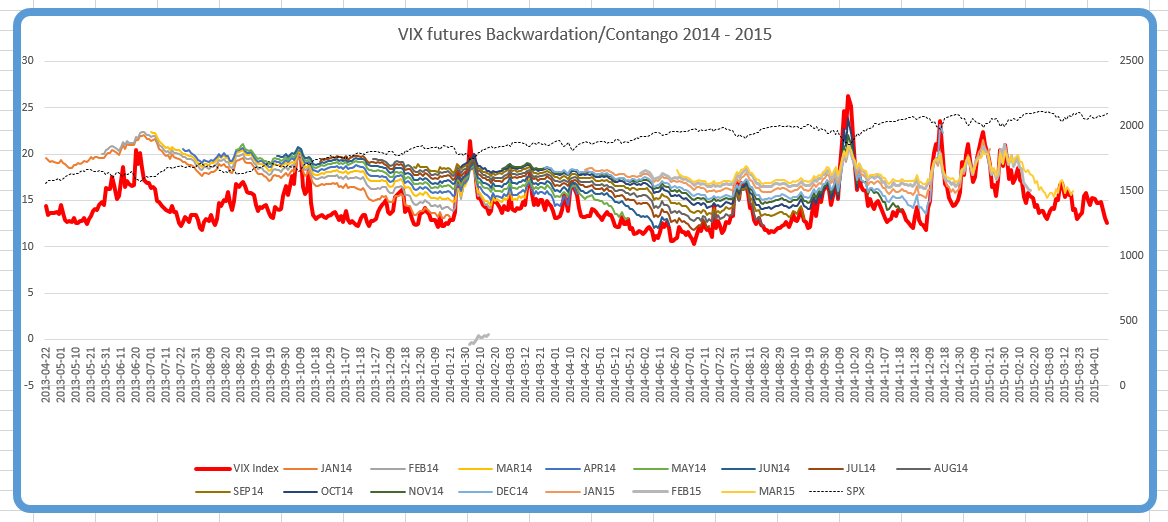 zdravím, při svém zájmu o hedge portfolia formou derivátů volatility bych se chtěl vrátit ke grafu VIX Indexu. Není možné přehlédnout dva významné faktory na grafu, prvním je support na hodnotě 10 a druhou vlastností jsou ostré vrcholy cenových výkyvů VIX Indexu. Protože, jak jsem již uvedl výše VIX Index je spotová cena volatility tak se nedá přímo obchodovat, obchodovatelné jsou pouze deriváty tohoto VIX Indexu - VIX futures (VX). Na tyto jednotlivé futures jsou potom obchodovány opce, to jsou ty opce, které vidíme v opčním řetězci v jakékoliv platformě, byť jsou označeny jako VIX, ale jejich podklady jsou VIX futures nikoliv VIX Index. Protože ostré vrcholy na grafu VIX Indexu se dají takto jednoduše zobrazit a VIX futures jsou odvozeniny od VIX Indexu, začaly mě zajímat pohyby jednotlivých VIX futures zejména z pohledu toho, jak těchto pohybů využít pro zajištění portfolia. VIX futures jsou obchodovány na derivátové futures burze v Chicagu (CBOE Futures Exchange - CFE), aby je bylo možno vidět v TWS od IB je potřeba si povolit data z této burzy do platformy (měsíční poplatek 2,5 USD) Ticker je VX, jeden bod VX je 1.000,- USD, tzn. nákup za 14.50 x prodej za 15.60 = 1.10 zisk = 1.100,- USD. Podstatné na VIX futures je ale jejich cenová struktura. V normálním stavu, kdy nejsou žádné ďábelské turbulence na SPX podkladu je struktura těchto futures stejná jako u většiny klasických futures, to znamená, že ceny vzdálenějších futures jsou dražší než ceny bližších kontraktů (contango) a také vyšší než VIX Index samotný. Pokud ale začne SPX klesat, tak se tato struktura začíná měnit a ceny vzdálenějších futures mohou být nižší než ceny bližších kontraktů a VIX Indexu (backwardation). To byl můj odrazový můstek k dalšímu zkoumání, jak tyto jevy vyhodnotit a využít k zajištění portfolia podobnému nebo identickému ke SPX. Přikládám graf VIX Indexu a cen jednotlivých futures kontraktů za období 2014 - 2015, kde jsou jasně vidět dvě období, kdy VIX Index (tlustá červená křivka) je nad cenami jednotlivých futures kontraktů (tedy situace backwardation). Dalším grafem je to samé za období 2013, kde pouze jeden takový výskyt, ale je tam zachycen další moment - značná vzdálenost VIX Indexu o ceny jednotlivých futures na začátku roku.