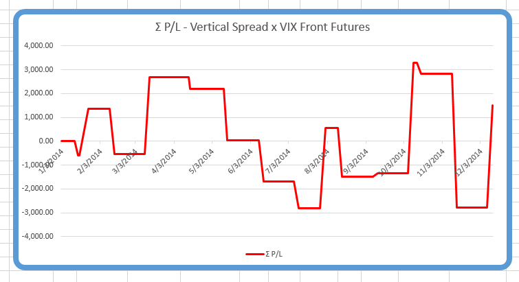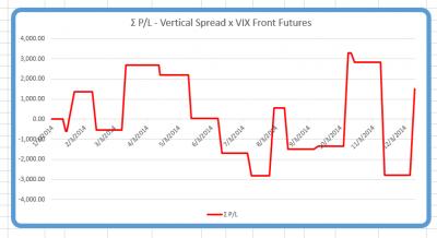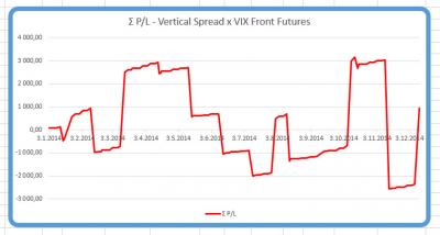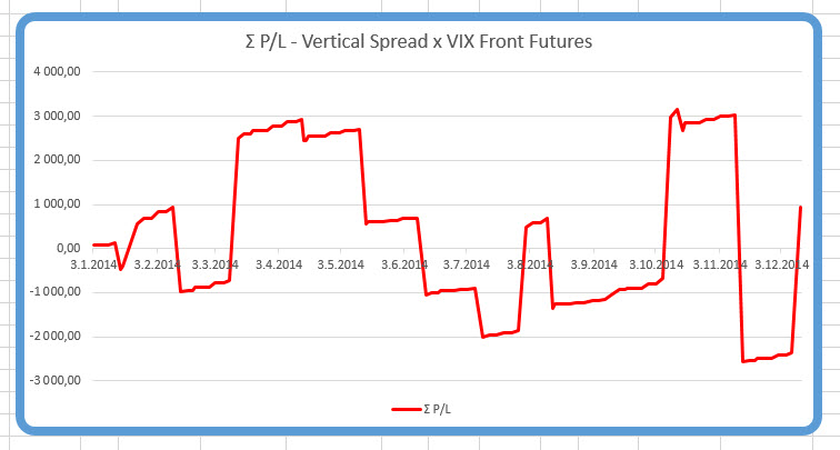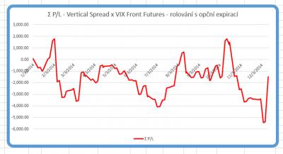 zdravím, protože lze k příspěvku přidat pouze dva obrázky, musím příspěvek rozdělit. Chtěl bych ještě k backtestu výše, kdy nechávám k drženému Credit Put Vertical Spreadu působit jako hedge VIX front futures, které roluji před expirací tohoto futures. Ztráty jsou viditelné jak na rolování, tak na poklesech futures po předchozích vystřeleních tohoto futures. Na přiložených obrázcích bych chtěl výše uvedený graf celého backtestu rozdělit na dvě části. A/ První obrázek je stejný graf, ale pouze P/L opčního drženého spreadu bez zajištění čímkoliv. Je vidět, že celkově čtyřikrát bylo dosaženo maximální ztráty 1000 USD, kdy SPX prorazil také Long Put opci, tedy spodní část Put Spreadu, takto by se pozice vyvíjela bez zajištění. Ztráta za rok 2014 - testované období - by představovala -572 USD B/ Druhý obrázek je stejný graf, ale pouze P/L rolovaného VIX futures, tedy pohyb hedge nástroje bez jakékoliv opční pozice, kterou chceme zajišťovat. Zisk za rok 2014 - testované období - by představoval +1520 USD, ovšem tento je způsoben posledním obchodem v roce, takže je profit víceméně náhoda, jinak graf osciluje okolo nuly celý rok. Je vidět, že toto zajištění, tedy tento způsob je nevhodný a do držené pozice, kterou chceme hedgovat, vnáší značný chaos, složený graf celé hedge pozice je značně podobný pouze grafu samotného futures, opční spread jako by ji vůbec neovlivňoval.