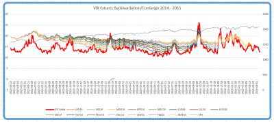 Taraka, ano, opět dobrá úvaha, nastavit nějaké limitní ceny pohybu na VIX, vystoupit a vyčkat na uklidnění situace. Já ale hledám "permanentní" hedge, tedy nástroj, kombinaci nástrojů, která bude alespoň nějak konzistentně trvale a dlouhodoběji ochraňovat a zároveň nepoškozovat držené portfolio resp. jeho výkonnost. Protože jsem se rozhodl pozvolnými postupnými přískoky pilovat svůj backtest do nějaké podoby, zkusil jsem využít dalších vlastností futures na VIX. Musím ale mírně zateoretizovat. Protože jsem je možné vypozorovat ostré výstřely na grafu VIX Indexu současně s jeho ostrými pády, musel jsem se s toto skutečností nějak vypořádat, když právě tyto silné růsty a poklesy vedly ke znehodnocení hedge pomocí futures. Musel jsem se proto zaměřit na cenovou strukturu jednotlivých futures kontraktů. Na jednom z dříve zveřejněných obrázků je vyobrazeno chování jednotlivých futures vzhledem ke spotové hodnotě VIX Indexu. V období, kdy dojde k silnému pohybu dolů na podkladu SPX se narušuje cenová struktura jednotlivých futures kontraktů a z obvyklého "klidového" stavu, kdy jsou jednotlivá vzdálenější futures dražší než bližší kontrakty (contango) a dochází k backwardation, tedy ceny bližších kontraktů jsou vyšší než ceny vzdálenějších, které cenově zaostávají. Toto je typický stav při výprodeji. Sledování tohoto jevu jsem se pokoušel využít. Je zvláštní, že v sekci obchodování komoditních spreadů je tato koncepce nevyužívána. Zaostávání za spotovou cenou komodity může totiž sloužit jako dobrý indikátor pohybu. Nezřídka je na různých podkledach vidět zaostávání ceny futures za spotovou cenou, naposledy si na ni vzpomínám tuším loni v létě na vepřovém mase (Lean Hogs). Důležitá je ale skutečnost, že VIX futures se z contanga do backwardation dostávají velmi rychle, ale co je neméně důležité, taky se z backwardation do contanga mají tendenci rychle vracet !!! To byl další impulz k prostudování a k prozkoušení. Opět ve stejném období 2014 se stejnou opční pozicí - opční Vertikální Put Credit Spread na SPX na weekly sériích vypisovaný každý týden ve vzdálenosti 2% OTM s rozsahem strike 10 bodů, jsem opět pořizoval hedge kupováním Long front futures kontraktu na VIX, ale takovým, že nákup a prodej futures probíhal ve stejných dnech jako pořizování a expirace opčního spreadu. Co jsem však zohlednil byla skutečnost, že v případě, kdy na trhu VIX futures byla situace backwardation (front futures byla levnější než VIX Index - spotová cena), tak jsem tento kontrakt kupoval do pozice Short, tedy předpokládal jsem, že se situace uklidní a bude vše mít tendenci návratu k cenové struktuře futures do contango. No a výsledek je na přiloženém grafu. V době kdy jsem v období 2014 pořizoval portfoliovou pozici Put Spreadu a hedgoval ji nákupem Short Futures podle pravidla výše, tak toto se událo v šesti případech - v ostatních obdobích jsem byl klasicky Long futures jako v předchozích backtestech. Výkonnost hedge mě velmi převapila, Equity křika je výrazně hladší a nikdy neklesla pod hodnotu nula.