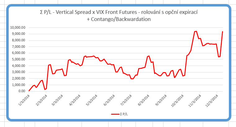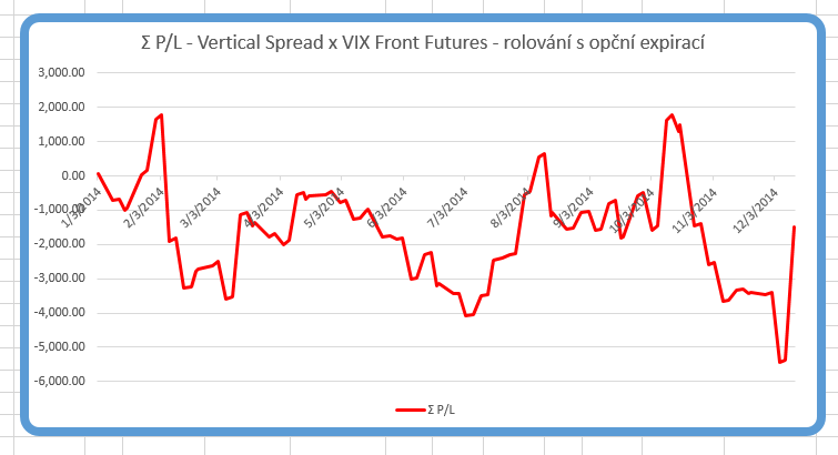 Taraka samozřejmě jsem přemýšlel, jak tento efekt rychlých "vzestupů a pádů" eliminovat. Tvůj nápad je samozřejmě akceptovatelný, ale co je "určitá hranice VIX", co je moc a co je málo u VIX, jak to kvantifikovat a vyhodnotit? Málo je jasné, hranice 10 je historickým supportem, níž to ani jít snad nemůže, ale co je "horní hranice" ? V době finanční krize 2008 -2009 bylo například 50 pořád málo. V testování hedge pomocí VIX futures jsem zkoušel další vylepšení testovaného období 2014, prostě jsem se rozhodl "postupnými přískoky vpřed" prozkoušet další vylepšování equity křivky celé pozice. Ve stejném období 2014 se stejnou opční pozicí - opční Vertikální Put Credit Spread na SPX na weekly sériích vypisovaný každý týden ve vzdálenosti 2% OTM s rozsahem strike 10 bodů, jsem opět pořizoval hedge kupováním Long front futures kontraktu na VIX, mým záměrem ale bylo celou pozici "rozvolnit" tak, že jsem VIX futures kupoval vždy s pořízením opčního spreadu a s expirací tohoto opčního spreadu jsem tento futures kontrakt prodal (tedy týdenní frekvence obchodů). Cena futures měla více kopírovat svou cenu a nevykazovat tak velké propady a růsty jako při držení VIX futures celý měsíc až téměř do jeho expirace. Na přiloženém grafu je vidět, jak to dopadlo - nic moc, graf opět silně osciluje a téměř celou dobu se pohybuje pod hodnotou nula, není již tak kostrbatý, ale stále to není to pravé, co bych si představoval, musely přijít další nápady...