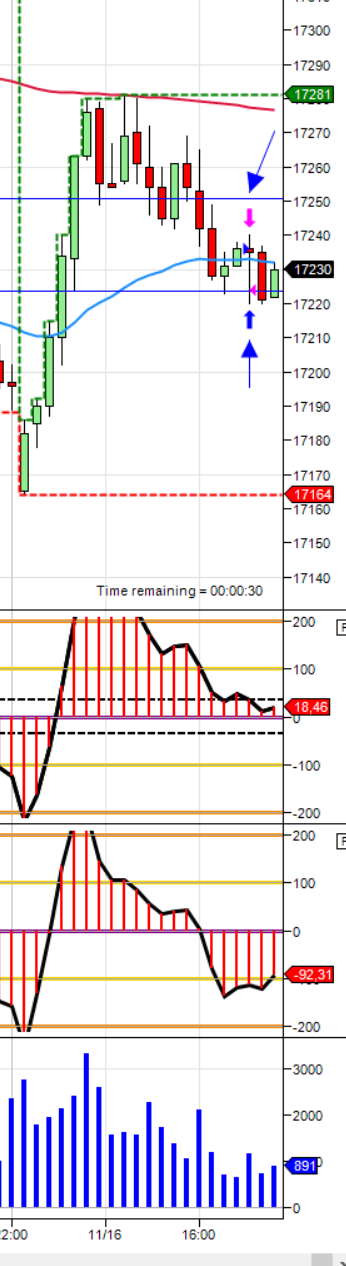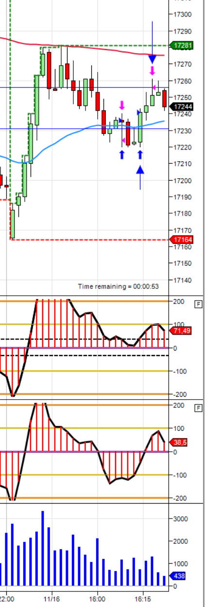 Jak jsem kdysi slíbil, tak přidávám i dva obrázky obchodů z jednoho dne, první obchod skončil ve ztrátě a druhý v zisku. Vstupy jsou na konci svíčky, ale někdy to ukazuje už vstup uprostřed nové svíčky. První obchod skončen ztrátou 10 ticků, tedy 54,02 dolarů i s komisí a druhý obchod byl v zisku 15 ticků, tedy 70,98 dolarů včetně komise.