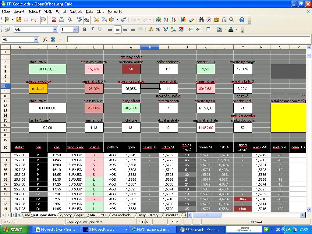 trošku jsem si hrál s tím výtvorem od tebe...je to dobrá věc :),což to,ale když tam nechám statis.1 lot,a mrknu na equity tak je lepší než s MM..zdá se mi to divné..A také jsem si všiml,že mi to nechce dopočítat do BE,a bere to jako ztrátu..musel jsme to přepsat ručně..!!..přepsal jsem do čistého MM jen poviné věci..datum,den,cas,par,pozice,pattern,open,mae,mfe..ale nějak to nejde podle plánu...pokud to přepišu v tvé formě..tak to jde,a přepiše to i BE,ale když jsem topřepsal do nového,tak ne..a ta equita s MM je taky čudná...systém je dlouhodobě výdělečný..a MM by mu měl přidat ,ale nějak se neděje