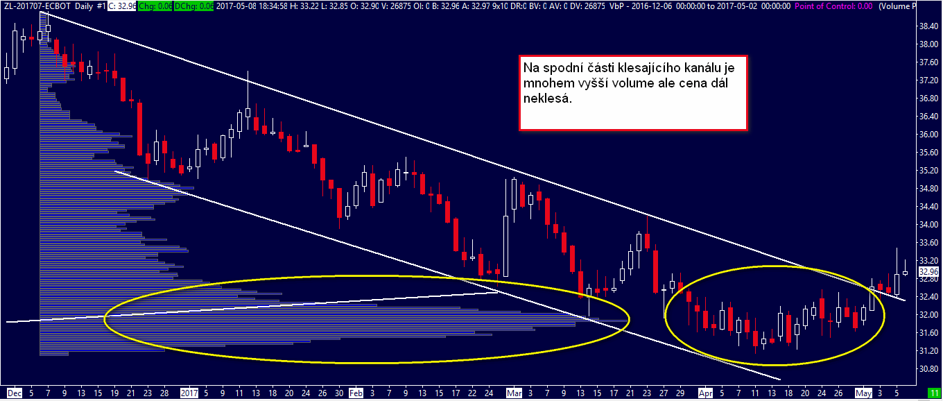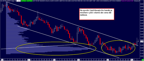 Na Volume profilu se mi líbilo, že na ceně kolem 32 USD je objem velmi vysoký a cena v klesajícím kanálu dál neklesá - obr.1