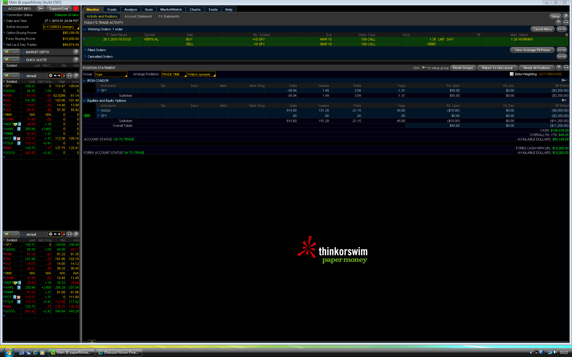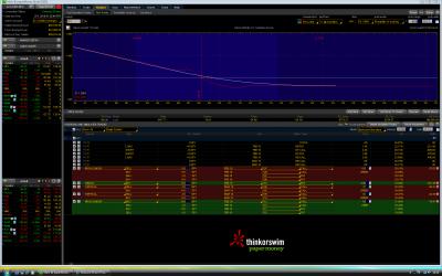 robino87: takze kdyz si vyberes trh a nastavis datum, tak dalsi kroky jsou (ja jsem ti vybral priklad opce Dec09 otevirane 18.11.09 30 dni pred expiraci na SPY): 1. vypisu vertikalni spread (nenapsal si jaky - jestli PUT nebo CALL, tak jsem vzal PUT) - prava strana opcni tabulky, najdu si vhodnou deltu - D24 na striku 106 - tam das prave tlacitko mysi a das sel verticall 2. zmenis si Qty na 1, abys mel vysledky na 1. kontrakt 3. Strike - tam pro pojistku si posunes strike na 104 (automaticky tam pada 1 strikovy SL) 4. ve sloupci Trade Date mas datum vypisu, pod Price je premium, ktere inkasujes 5. A vysledek zjistit bud posouvanim P/L Date - bude se ti menit vysledek ve sloupci P/L Open a nebo se muzes divat dolu do grafu - tam je zluta linka P/L, a kdyz se po ni budes hybat, tak se ti bude v hlavicce grafu objevovat aktualni vysledek daneho dne. To by asi stacilo. Lada P.S. jenom abys vedel, tak premium, ktere se ti ukazuje je vzdycky MID (coz znamena stred mezi bid a ask), takze je dobre si to v backtestu vzdy zhorsit. V SPY nastesti ten rozdil mezi bid/ask neni moc velky - tak 1 az 2 USD, ale treba na indexech jako je RUT to uz je 20 USD apod. To jenom kdybys chtel spready testovat tam. Jinak pokud nechces vylozene smerovou strategii jako je vertikalni spread, tak muzes pouzit Iron Condor, coz jsou 2 vertikalni spready - jeden call nad aktualni cenou a druhy put pod aktualni cenou. Margin bude stejny, premium ale bude dvojnasobne. Akorat je to nesmerova strategie - pocitas, ze trh nikam nepujde, coz u SPY neni nic neobvykleho.