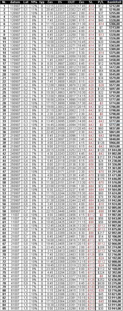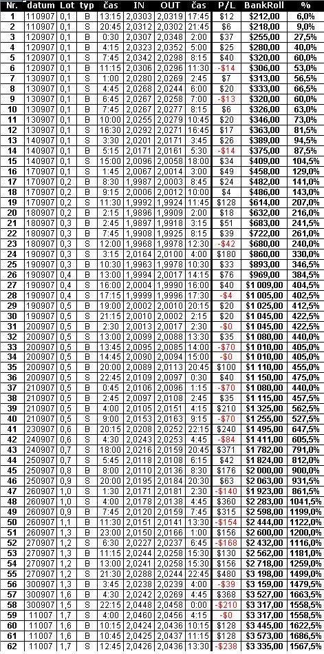 Ano, u zisku jsem ho odečítal, chyběl jen u ztráty. Samosebou, že stávající průběh $200 = +1minilot je dosti agresivní, ale SL je všude 10 pips. Osobně si myslím, že v reálu to takhle půjde, i kdyz asi přesně neuhlídám ty přechody na zyvšení lotů. Jinak co se týče délky knotů, tak nějak je beru v potaz na projektu pro TF1day. Ted tady na TFM15 nehrají až tak velkou roli, snad jen volatilnejsi je vyhodnejsi.