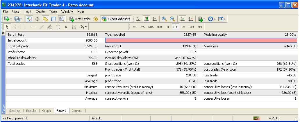 BigBull: IBFX posouvá čas z GMT na GMT+2. Napsal jsem jim protestní dopis, doufám, že se zasmáli a já doufám, že mi alespoň odpovědí :D Můj systém (nikoliv Hansův, jen z něj vycházím) jsem testoval na datech od Alpari, která jsou od 16.6.2004. Průměrně za měsíc je 196 pips ať dávám jakékoliv množství lotů. Report přikládám. Vystupuji z obchodu v 19 hodin nebo na SL nebo TP. SL neposouvám, ale po 25 pips zisku jednorázově posunu na vstupní cenu.