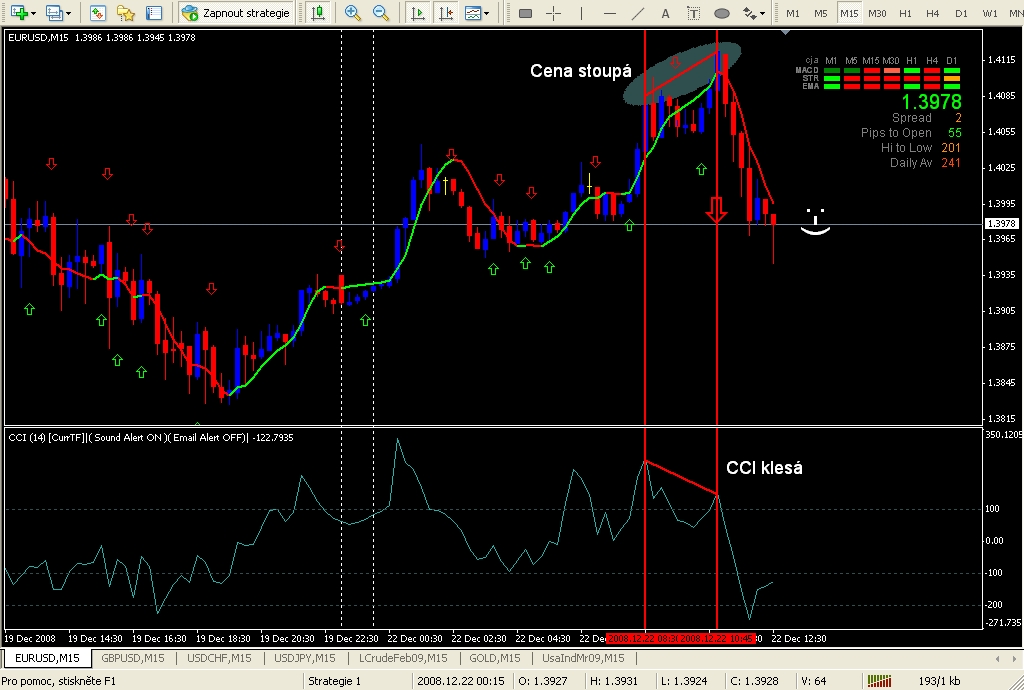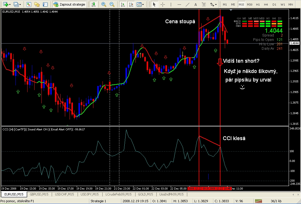 v tomtéž okamžiku koukej na cenu, která musí jít opačně, než CCI. Na obrázku je to dost názorně. Zkouším to na TF 15. Min na TF 5. Na menším to asi fungovat moc nebude. Spíš na TF30. Ale to teprve čeká na odzkoušení.