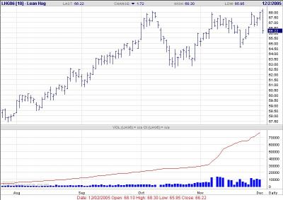 Dalsi trh,ktery se mi jevi docela zajimavy je LHG06. V poslednich mesicich se utvari u tohoto kontraktu docela silny strop,ktery byl sice posledni den prorazen,avsak pohyb se otocil, utvoril se mi tam dvojity vrchol 28.11. a 2.12., nebo myslite,ze je to dosti nevyrazne? No,uvazuji zatim dosti nejiste, snazim si najit nejaky zpusob,jak pohlizet na dane grafy a dokazat si z nich neco vyvodit. Zkousim sve poznatky uplatnovat i na jinych trzich,avsak nyni se mi jevi pouze tyto 2 jako zajimave pro vstup do pozice.
