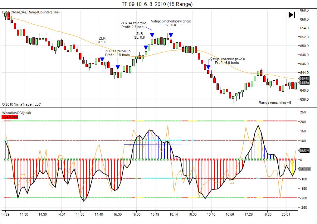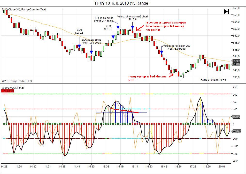 Ahoj znovu ja :) ja sice Ghosta ee, ale venoval som sa mu trosku, ale pretoze mi pride velmi subjektivny a videl som ho uz potom vsade :) naviac som nevedel prist na nejake zmysluplne pravidlo, na zaklade ktoreho by som rozhodoval, ktoreho vziat a ktoreho nie, tak ho neobchodujem. A krasnych ukazkovych Ghostov som nenasiel tolko, aby ta vzorka obchodov mala pre mna dostacujucu vypovednu hodnotu. Teraz k tvojmu obrazku. Ta ciara (trendline) na CCI histograme, by sa podla mna mala kreslit nie vodorovne ako ju mas ty, ale spojit paty tych dvoch veciek, v tomto pripade je to sice vstup na rovnakej usecke. K vystupu, podla mna mas vystup spravne. Neexistuje zaruceny vystup, ktory by ta podrzal az do konca trendu. To sa proste neda. CCI hook from extreme je jeden zo sposobov, v tomto pripade krasny zisk. Vobec sa netrap tym ze trh isiel dalej, ty mas svoj zisk a basta. Nabuduce sa to v tom extreme moze otocit a budes si hovorit aky super vystup som pouzil az na konci trendu. Dalsi z moznych vystupov, je ked sa CCI dostane uz nad/pod +-100 tak az po spatnom prekroceni, coz by ta v tomto konkretnom pripade podrzalo dlhsie. Je to vsetko len o otestovani si roznych Woodieho vystupov a ktory ti najlepsie sedi, alebo nejaky svoj vystup. Ja napriklad v pripade ze sa CCI dostane nad hranicu 100, vystupujem az v momente, ze ide cena proti mne. Coz je velmi jednoduche na interpretaciu, pretoze na RB presne vies kde bude dana usecka uzatvarat a tak proste posuvas SL na tu hodnotu :) v tvojom pripade by ma to vyhodilo na tej prvej zelenej usecke, coz skoro zodpoveda vystupu ked CCI prekroci hranicu 100 naspat alebo aj mplayovmu 123 vystupu, tak ako by som ho interpretoval ja.