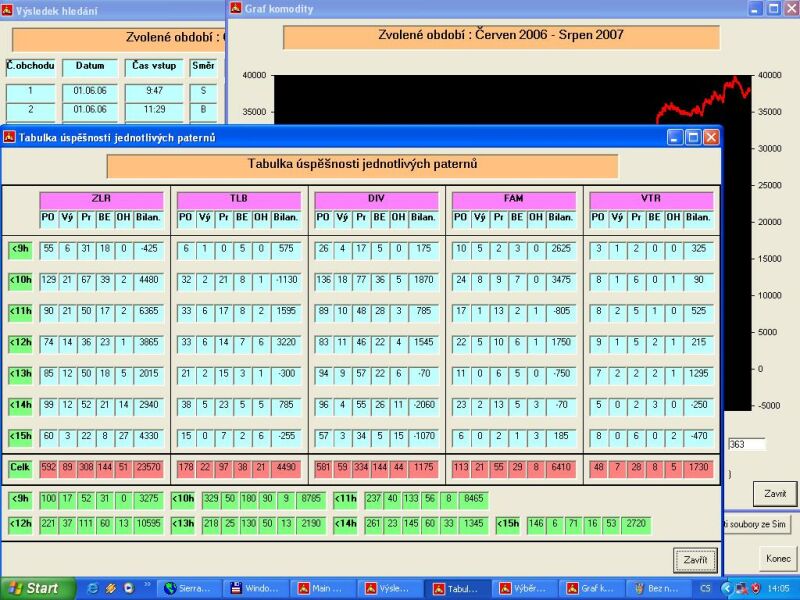 Chtel bych se s Vama podelit o vysledku backtestu za obdobi 15 mesicu zari 06 - srpen 07. Momentalne jsem ve fazi 2 :), kdy hledam co maji ztratove obchody spolecneho. Celkem jsem zklamany z protitrendovych divergenci, obchodovat od 15h do 23h se zda byt taky zbytecne. (WCCI s 5 paterrny, ER2,TF=3min, SL=120, PT=580, posun SL na B/E pri 180.) P.S.: Rad si vyslechnu jakykoliv komentar. (tu)