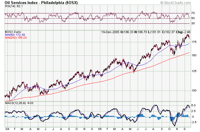 Zdravim vsechny, vcerejsek potvrdil "vyprodej" pred koncem roku, cca 3/4 akcii ktere sleduji vcera klesly. Vsichni asi vybiraji zisky, aby meli na darky :) . Nerad SHORTuji tak budu do konce roku hodne optrny a asi toho taky cast prodam. Fany : ceny akci tezarskych spolecnosti, stejne jako napr. rafinerskych spolecnosti v zasade hodne koreluji - na tech grafech DO a NDR je to videt na prvni pohled. Ja prikladam graf OSX - index ropnych spolecnosti a jeho prubeh je hodne podobny. Navic ceny techto akcii reaguji nejen na cenu ropy, ale i na rozhodnuti treba OPECu, ktera cenu ropy ovlivnuji. Z dlouhodobeho pohledu cena ropy pujde nahoru o tom asi zadna, kratkodobe bych vsak cekal ze jeste do konce roku v prumeru o neco klesnou. Uvedene akcie DA, NBR jsou na mne s cenou kolem 70 trochu drahe, ja bych miril do nizsich "sfer" treba TDW ( cca 46 ), nebo mezi mensi zacinajici spolecnosti. Podle mne je pri analyze nejzasadnejsi otazka jak dlouho chci akcii drzet, od toho se vyviji veskere dalsi uvahy. Ohledne brokera - ja jsem presel od Fia k IB a jsem plne spokojen - nizke poplatky, maji API tzn. moznost napojeni softu na automatickou analyzu, moznost obchodovani komodit, akcii, opci, warantu... Uspesne obchody Michal