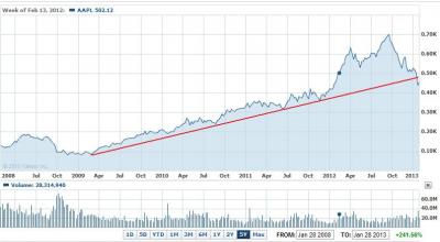 No, když jsem tu před půl rokem hovořil o tom, že do Applu není dobré investovat, že ho čeká strmý pád, tak jsem si mimo jiné spočítal další dno na hodnotě 442 dolarů. Přesto si tím hledáním dna nejsem nikdy vůbec jistý a tak nakoupím první balík nyní a druhý si nechám na případné zředění na hodnotě 350 dolarů. Každopádně na této cenové hladině bych investici nepovažoval za hrubou chybu ani v případě, že by Apple ještě klesl.