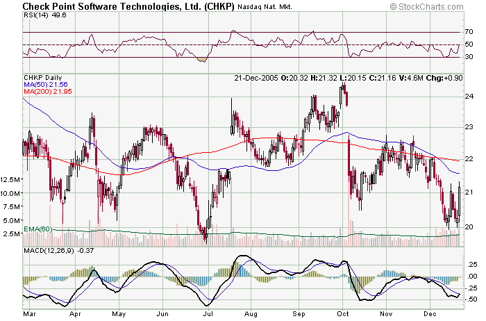 Oldas : vcera jsem zadnou ohledne CHKP nenasel, takze bych rekl, ze to bylo ciste na zaklade TA. Na grafu je videt dvojita podlaha. Par akcii s takovym pohybem ( 5-10% ) se da najit kazdy den, treba za vcerejsek jich je jen mezi tituly ktere sleduji 8. Kouknete se treba na MXO to vcera udelalo +53%. Jen by to chtelo vedet kdy prijde takovy pohyb den dopredu ;).