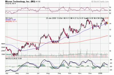 DD, akcie MU jsou velmi nadějnou investiční možností, pokud máte někdo nakoupeno, tak gratuluji, 30 min graf ukazuje pěkný break long signál, který bývá jedním z nejlepších, protože obvykle startuje dlouhodobější trend. Cena v pátek skončila váháním na R2, které je podle mého názoru ale spíše jen důsledkem opatrnosti před víkendem. Jelikož akcie získala vysoké momentum, je klidně možné, že pondělí začne gapem up přes rezistenci na 14.80. Cenový target v horizontu cca dvou týdnů bych viděl na 18 USD, tam bych rozpouštěl část pozice s tím, že by se vidělo, jak si s tou hranicí akcie poradí. Pozor - weekly graf ukazuje, že akcie je v sideways se snahou o uptrend, nicméně křivky budou akcii stále tlačit dolů, přestože daily graf už ukazuje vcelku pěkný uptrend. Bacha na těch 14.80, pokud se tuto hranici nepodaří překonat, vznikne tripple top a to by znamenalo bearish situaci. Nicméně jak jsem psal, věřím spíše v její rychlé překonání. Hodně štěstí