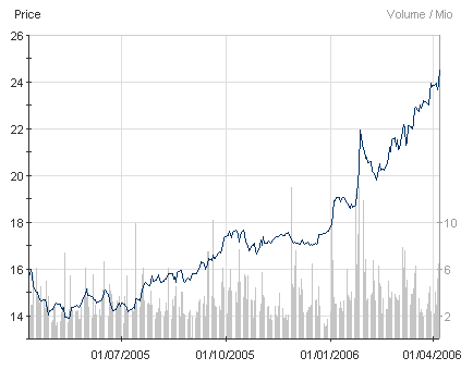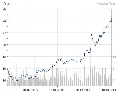 Dobrý den, zvažuji investici do strojírenského koncernu ThyssenKrupp. Akcie se mi jeví jako atraktivní, ikdyž zisk koncernu klesl o 23 procent proti stejnému období předchozího roku. Na oficiálních stránkách společnosti (www.thyssenkrupp.com) jsem zjistil, že společnost vyhrála kontrakt v Egyptě. Dále hodlá budovat továrnu v Brazílii. Chci se zeptat, jestli je výhodné do této společnosti investovat. 10.4.2006 v 17:40 byl kurz 24,96 EUR/ks. Já myslím, že tato společnost může růst, ale mám mírné obavy