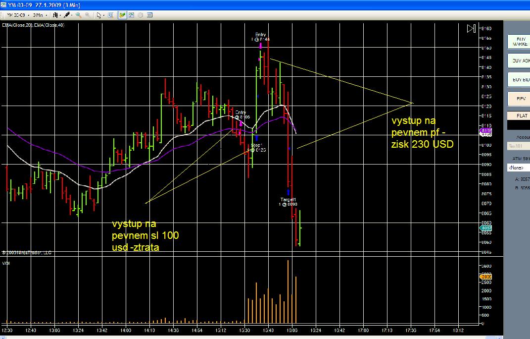 divit-muj OS s drobnymi upravami funguje i na trhu YM 3min.timeframe... Pri papertradingu s realnymi daty jsem dosahuji dennich zisku par set dolaru - ok... Ale dnes na stejne komodite jsem vstoupil na zaklade sveho signalu a ten behem 4 hodin vykazal okolo 200 ticku-tj.1000 USD...