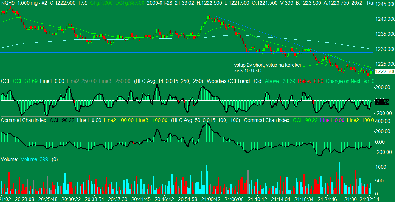 Mirek F. včera jsem neměl ani jeden obchod, byl to jeden velkej chop, alespoň pro mě. Obchoduji teda večerní seanci od 20 do 22 hodin. Dneska se to taky moc nehejbalo, nakonec jsem udělal jeden obchod. Potenciál byl nějakých 9 bodů. Přikládám screen. PS NQ mi vyhovuj, protože je levnej, tick 5 USD a SL mi stačí 40 USD, je to super z psychologického hlediska.