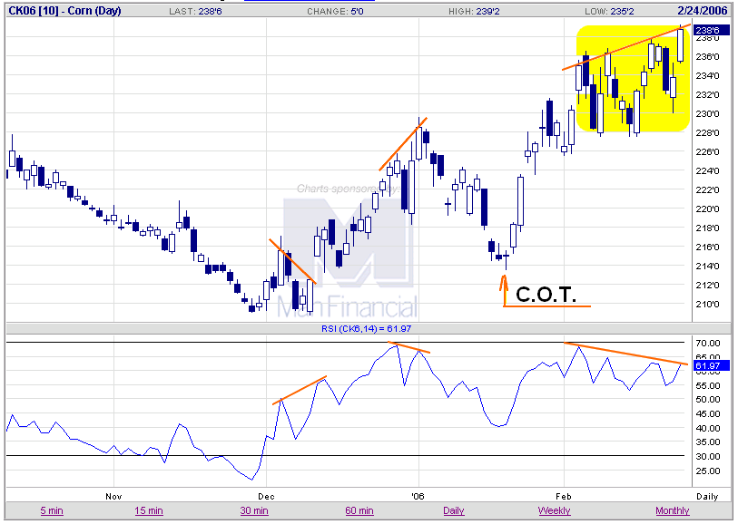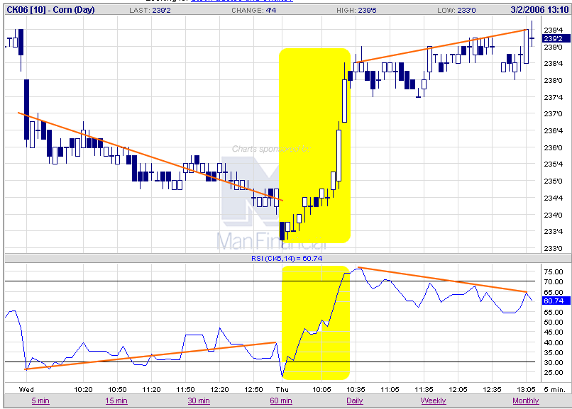 26.2. jsem se kukuřicí zabýval souhrnně 3 měsíce zpátky. Dneska uvedu, jak se na to poslední ( žlutě vyznačené období v příspěvku z 26.2.) dívám za dne na den. Nejedná se o žádnou velkou vědu. Jenom pro začátek zase uvedu svůj postoj k indikátorům všeobecně. Poté, co mě několikrát bolestně zklamaly a moje konto pokaždé zesláblo o pár stovek dolarů jsem je téměř zavrhnul. Nepoužívám žádný indikátor k tomu, aby mi něco signalizoval k nástupu do pozice. ( Teď píšu pouze o pozičním obchodování - v ID obchodování je to jinak, ale nejsem zatím ID obchodník, takže nemůžu soudit). Pouze divergence to přežily jakž takž bez úhony. Minule jsem se zmínil o divrgenci v rámci týdnů, pak dneska uvedu příklad v rámci obchodního dne. Už už to může vypadat, že se trh pohne naším vytouženým směrem a druhý den je všechno jinak.... V rámci denního pohybu trhy sleduji na 5 min. grafu se současně zapnutým RSI indikátorem. Jakmile vidím, že se trh pohybuje v divergenci beru to jako znamení toho, že obchodování není spontánní, že je pod vlivem nějakých snah Commercilas, kteří zrovna teď prosazují své cíle a na průběhu denního obchodování je to i vidět ( alespoň pro mne) právě tou divergencí - tím nesouladem, pnutím nebo jak bych to vyjádřil. No ale jsou také chvilky, kdy je třeba nechat "malé holky a kluky" taky trochu proběhnout, dát jim pocit, že si můžou trochu zaobchodovat, že teď už to půjde podle nich.... Asi to bude ten "kousek volnosti" mezi divergencemi, aby mohli nakoupit ( taky komu pořád prodávat, když byla loni taková nadúroda) - aby je bylo v časech budoucích o co obrat, až to půjde short. Pro ty, kdo nastoupili do long pozice podle COTu v období cca 23.1. je to naopak signál k potvrzení toho, že jejich zisky ještě nějaký čas teď už jen mírně, ale porostou. Greenhorn.