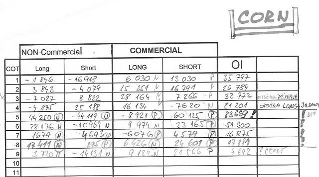 Zdravím, pro vyhodnocení COTu jsem si vyrobil tuhle jednoduchou tabulku a dívám se na to jen přes ta čísla. Jedná se změny u jednotlivých skupin oproti minulému týdnu, které si přepisuji tak, abych je měl přehledně pod sebou. Ono se mi potom na to dívá jako na graf, jemon to není interpretované(deformované hlavou někoho jiného). Zde pak pěkně vidím, jak Commercial mění své chování a jestli Spekulanti(NON) adekvátně reagují - čili, jestli už jim na ten špek skočili. Do jednotlivých kolonek připisuji P- že se jedná v podstatě o prodej a N-nákup. Pak je to ještě přehlednější. Volume a OI je nedílnou součástí hodnocení. Ještě se kouknu na kontraktní měsíce - kvůli FND, LTD. Tohle je v podstatě všechno, co k vyhodnocení podle COT. Čísla 1 až 9 v prvním sloupci jsou čísla jednotlivých týdnů v letošním roce, kdy COT vyšel. Úterý uzavřen, pátek-zveřejněn. Greenhorn.