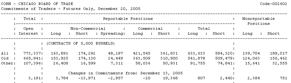 Dobrý den, připojím svůj názor na kukuřici, protože podle mého názoru po včerejším obchodním dnu a večerním COT je na co se dívat. Při prvním zběžném pohledu na graf by se mohlo zdát, že jednoznačně long - tady souhlasím, ALE: - trochu pochybnost ve mě vzbuzuje vzhled poslední candle - doji - která je všeobecně interpretována jako nerozhodnost trhu, - COT (20.12.05) - moje interpretace je asi ta, že spekulanti ( non_commercial) zavětřili svou příležitost a ti, kto obchodují podle TA systémů už dostali pokyn(od svého obchodního systému) k nákupu, takže oproti COT ze 13.12. je u nich nárůst long pozic o +3 784, současně pokles short o -13 971. ZAJIŠŤOVATELÉ ( Commercials) - nejdou do long pozic zde je dokonce pokles -20, otevírají ale short pozice + 19 368. Můj závěr tedy je, že spekulanti už začínají věřit v nastoupený býčí trend, naproti tomu zajišťovatelé otevírají pouze short pozice. Asi věří tomu, že cena opravdu ještě klesne. Podle mého názoru se se to ještě může celé obrátit, nebo by mohla proběhnout nějaká korekce. Už dlouho čekám na svůj reálný nástup do býčího trendu v kukuřici, zatím mi to nějak nesedí a asi bych nespal. Greenhorn.