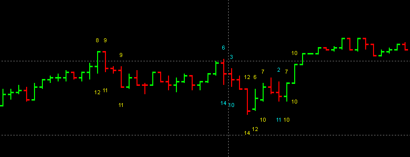 2 Raider : Temi pevnymi vzdalenostmi jsem myslel umisteni textu - tech hodnot nad/pod svickou. Ono se da udelat prekreslovani podle toho jak se hybe scale, ale jednak je to desnej opruz a hlavne... SC to porad prepocitava a prekresluje, takze kdyz mas otevrenych vic grafu, tak je to pak uz poznat. Proto si tam vzdycky dam neco jako offset pro info.. nekdy se to prekresluje s grafem, ale tak myslim ze to tak staci. Nechceme z toho zas delat profi indikatory ze jo :) Ty barvy z NT jsme rozklicoval tak, ze pokud rozpeti O/C zabira vic jak 50% rozsahu H/L tak je to jednou barvou, jinak druhou barvou. Takze na druhe zalozce (Subgraphs) jsem dal dve barvicky, kterejma se to da nastavit. Hodnoty jsou defaultne nastaveny pro NQ tak ja je vidis na screenu Velikost ticku - NQ 1 bod - 4 ticky = 0.25 Max. pocet ticku : 9 ticku = 2.25 bodu = 45 $ Odsazeni textu : 2 ticky = hodnota svicky se vypise 2 ticky pod/nad hodnotou L/H Velikost textu : velikost fontu Start a konec seance : je tam pro to, ze jelikoz se indikator odviji od ceny, tak ho lze pouzit nezmeneny na jakekoli jine alternativni grafy. Coz by zpusobilo napr. u volume pres vikend zbytecne vypisy tech hodnot, takze se to da takto omezit. Soubor LKP_RangeCandleValue.jpg prejmenovat na LKP_RangeCandleValue.dll a nahrat ho do "c:\SierraChart\data\" At dobre slouzi ;) Rob