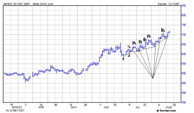 Momentální stav z mého pohledu je dosti nečitelný, nemyslím, že by se Wheat měla vyšplhat až na max. z 96 - 750, očekávám z krátkodobého pohledu korekci či medvědí trend pod 660 (double top) a z dlouhodobého (myslím, že se tomu říká sezonalita) cca 2 - 2,5 roku pokles ceny na S - cca 240. Anebo to půjde úplně jinak - známe to.