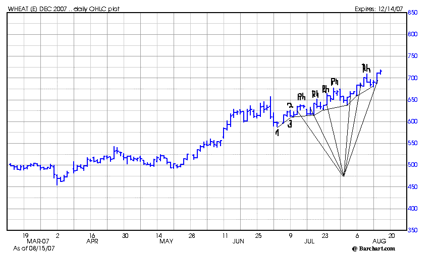 Dobrý den, sice nemám v plánu obchodovat wheat hned ze začátku, ale vložím sem ukázku ,,mého,, grafu wheat. 13.8. jsem spojil další korekční low a pokračuje tak uptrendline 14.8. nákup 2 kontraktů za 695,50 ... entry SL umístěn na 679,0 (=16,5 bodů x $50 = $825 risk na 1 kontrakt) 14.8. prodej 1 kontraktu za 710,0 (= zisk 14,5 bodů x $50 = $725) a posun SL na cenu 695,75 15.8 ... uvidíme jak to dopadne :) Jirka